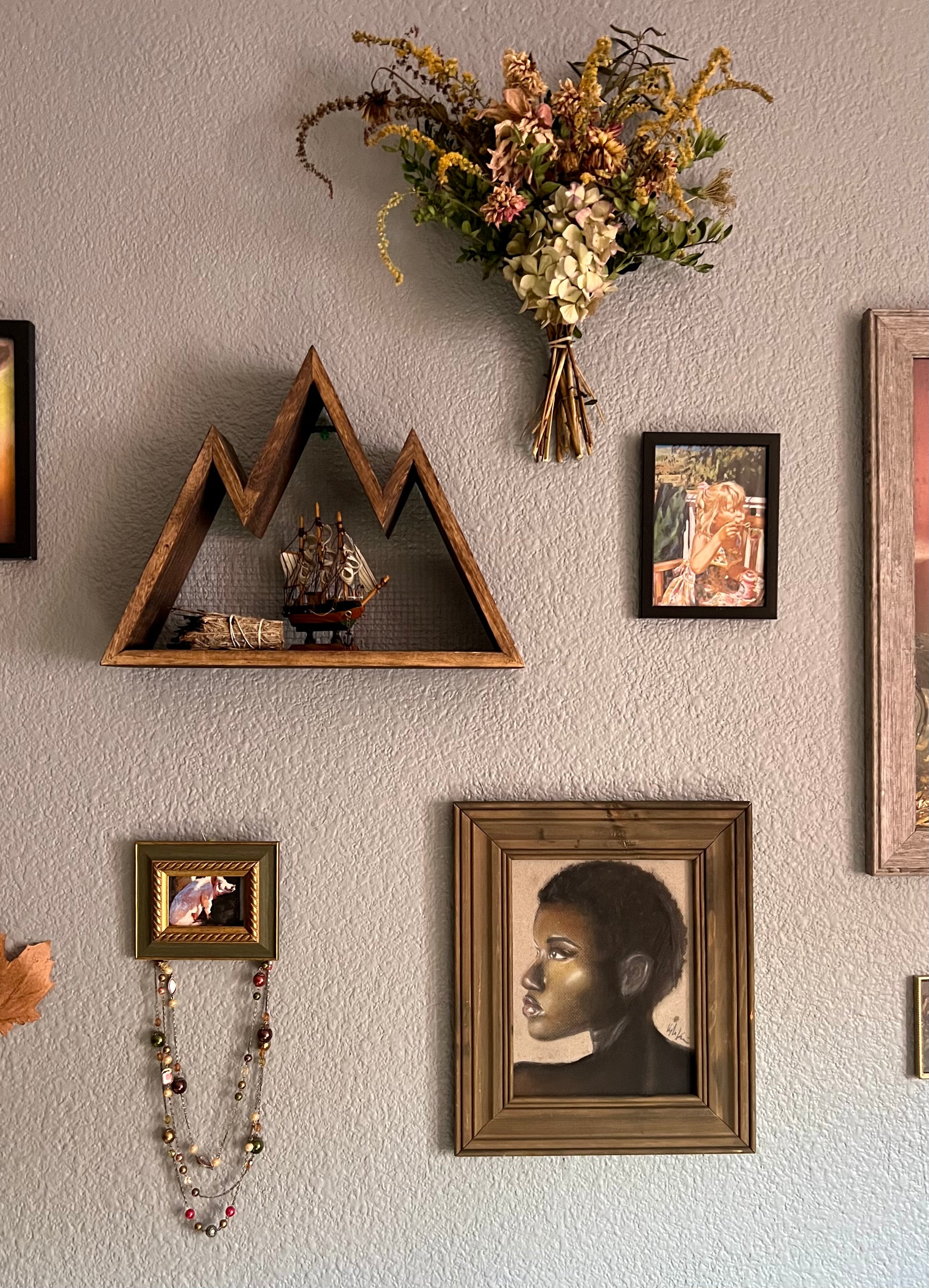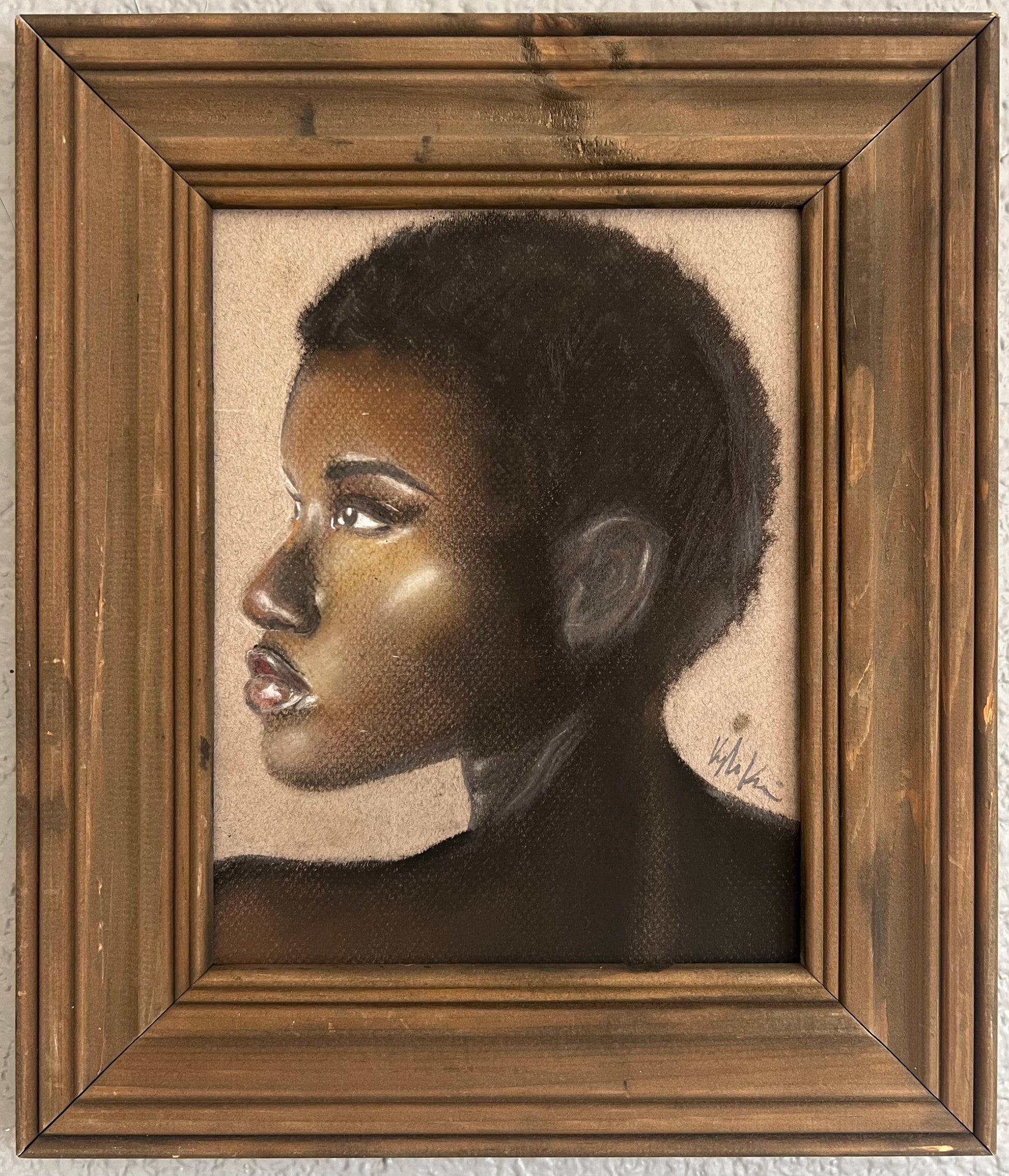 An original soft pastel portrait of a woman in quiet reflection. Framed and ready to display.